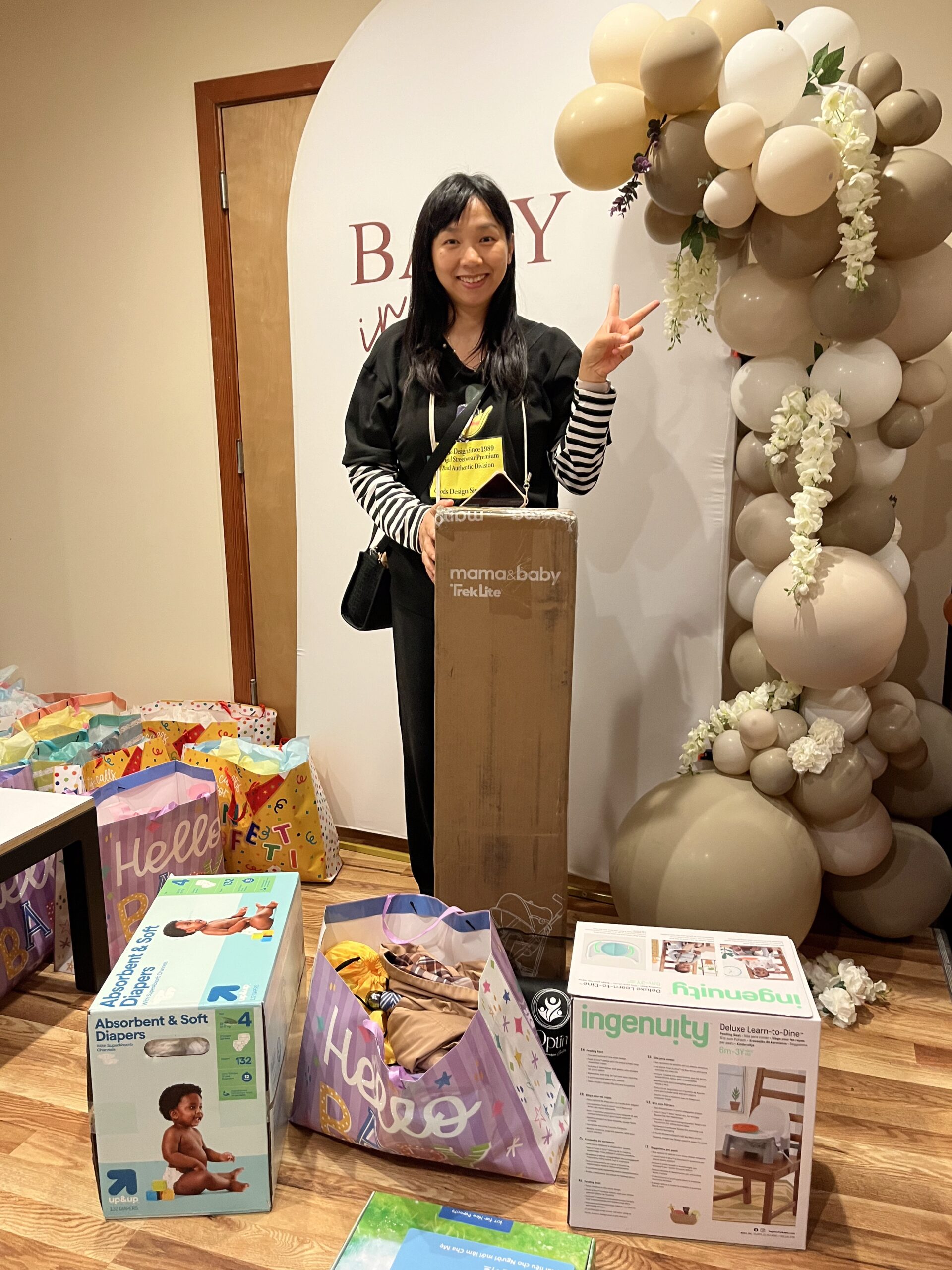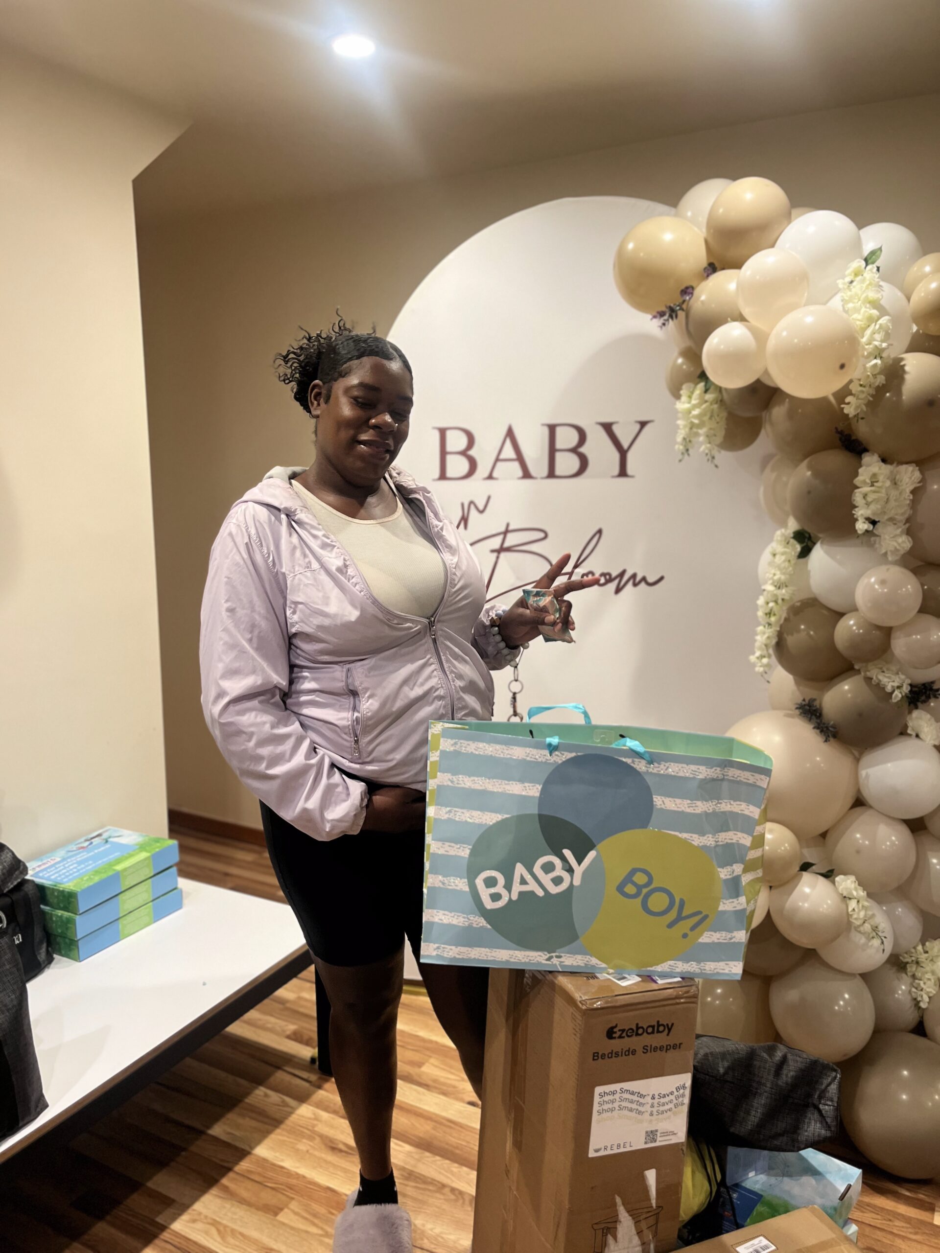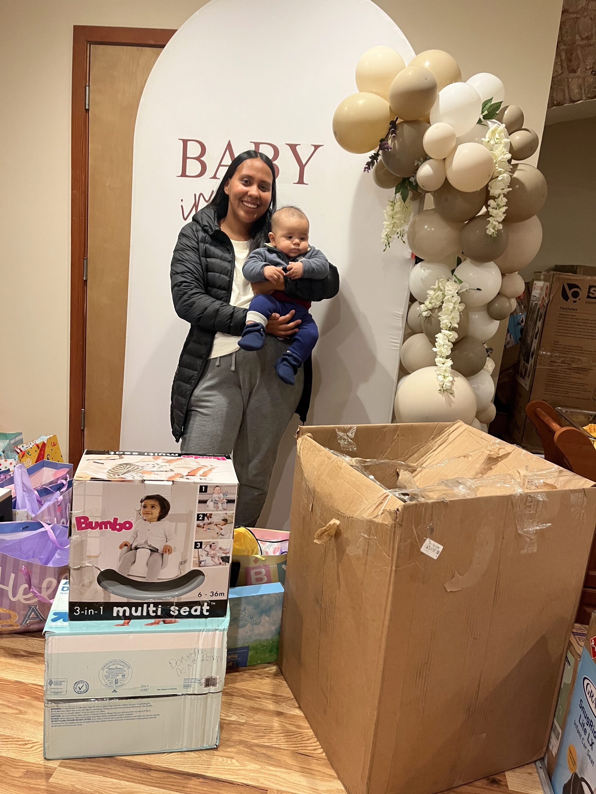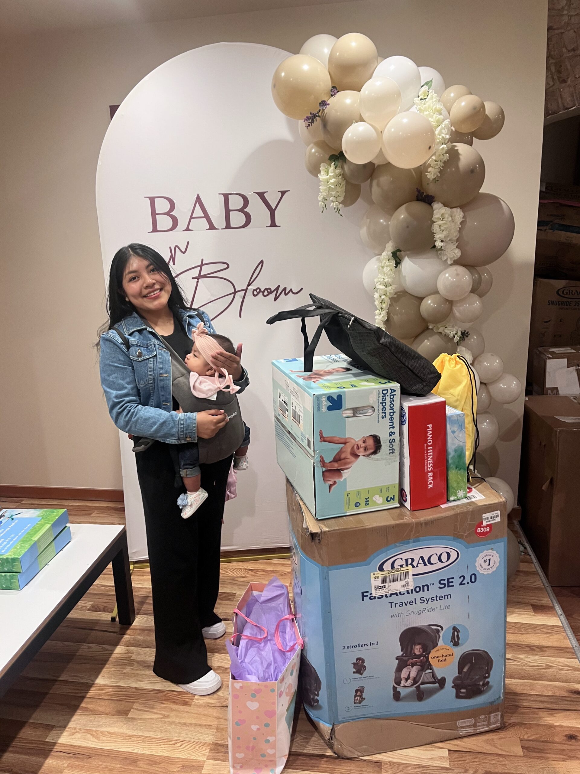 This mother is a single mother. She already has a two-year- old son. This family received a sleep sound machine, a swing, and a travel system (stroller and carseat), $20 gift card, pack of diapers, pack of wipes, highchair, and healthy meal resources.