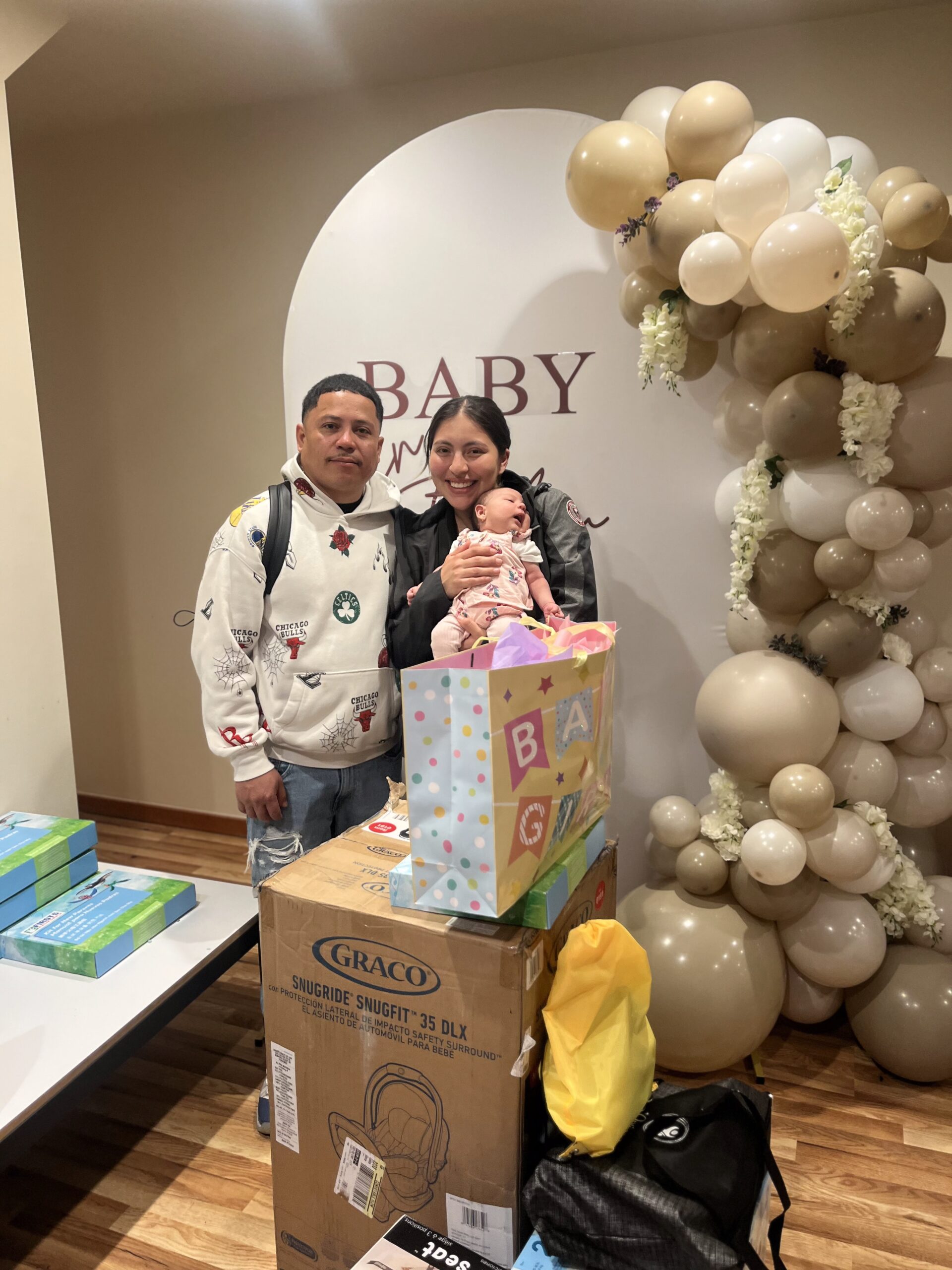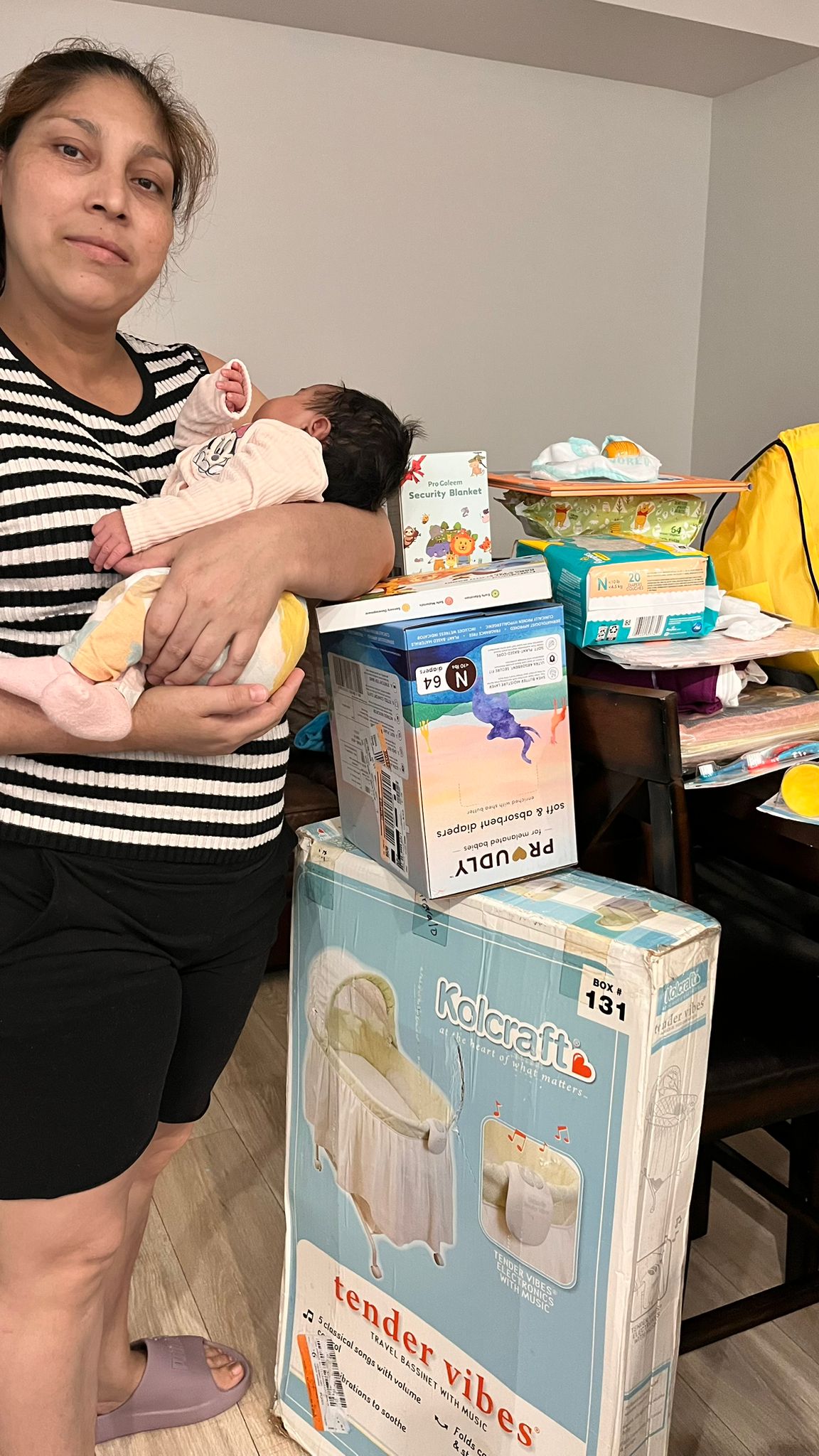 This family received a baby sling, $20 gift card, pack of diapers, pack of wipes, baby swing, and healthy meal resources. This family is homeless. My organization got her connected to another nonprofit that was able to get her and her family temporary housing.